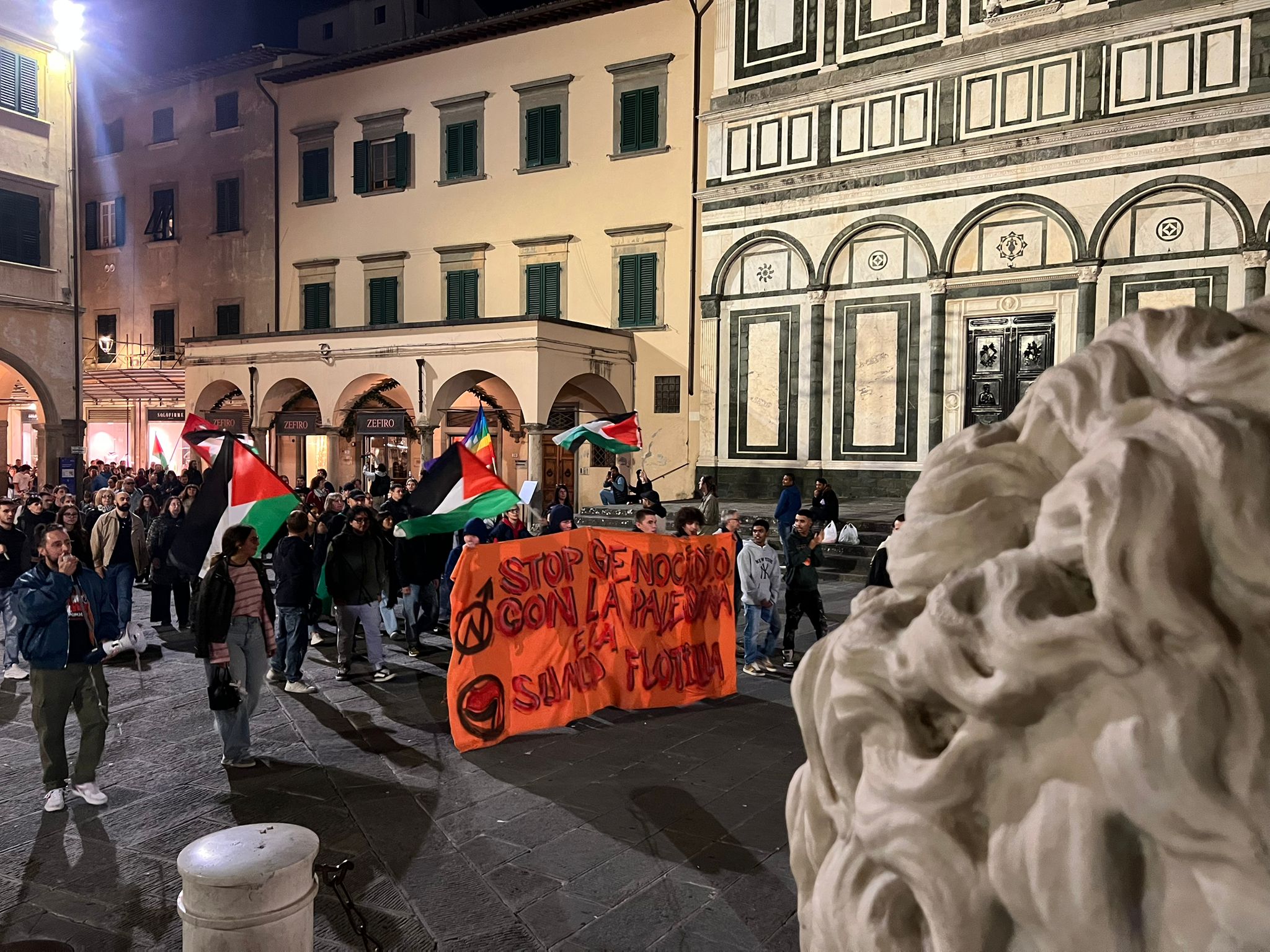 "Palestina libera" il grido che si è levato da una piazza dei Leoni riempita di cittadini, cittadine, associazioni del territorio riunite nella manifestazione che ha visto anche la partecipazione di tanti giovani. "Stop genocidio, con la Palestina e la Sumud Flotilla", questa la scritta sullo striscione in testa al corteo che ha attraversato, accompagnato da cori, il centro fino a raggiungere piazza della Vittoria, il ponte per Sovigliana, piazza Matteotti tornando poi al punto di partenza. Oltre 300 i partecipanti per la questura.