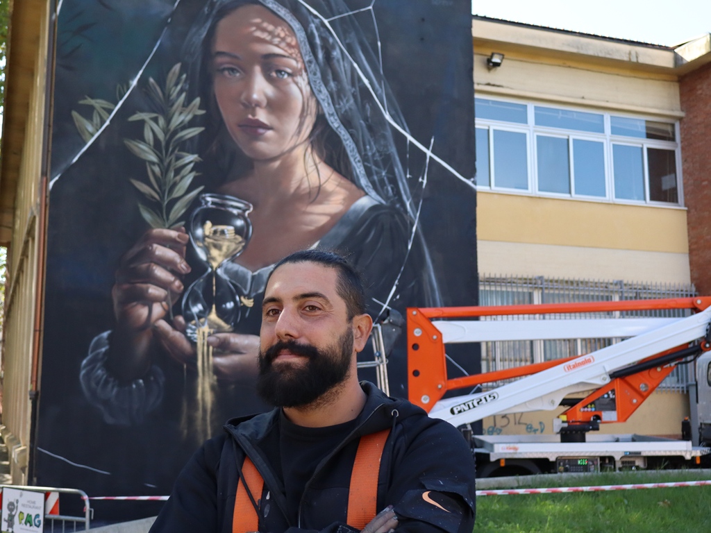 "La raffigurazione sul muro rappresenta Eirene, figlia di Zeus e dea della pace, che tiene in mano una clessidra infranta - ha spiegato Neve -. La clessidra rotta simboleggia che la pace è una questione di tempo: se la si gira non cadrà più sabbia, proprio perché è infranta. È un invito a non perdere tempo. Ho pensato che fosse una tematica molto attuale nel mondo di oggi, dove la pace è la sola risposta".