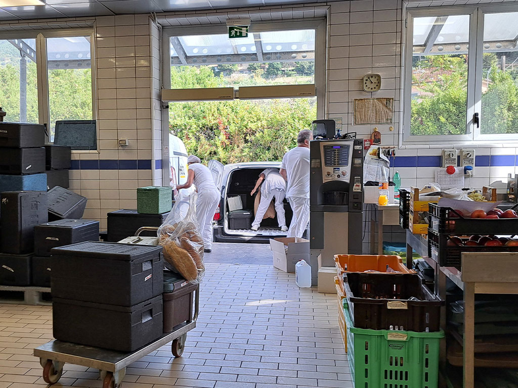 Ad accompagnarlo il presidente della partecipata comunale, Pietro Bertagna e il responsabile di produzione Paolo Bibolotti: dall'anticamera organizzativa, dove viene “compilato” il piano giornaliero raccogliendo e verificando le varie indicazioni dalle mense scolastiche, agli spazi per lo stoccaggio differenziato di prodotti confezionati (come pasta e acqua), carni, frutta e verdura; poi le sezioni riservate alla preparazione con forni, piani cottura, affettatrici e cuocitori fino all'ultima sala di “smistamento” dei pasti sui furgoni diretti a Pietrasanta, Massarosa e, da ottobre, anche in Liguria, dove 2 Comuni (uno già attivo, l'altro lo sarà dalla metà mese) si sono rivolti al centro di Strettoia per il servizio mensa delle proprie scuole: “A questo lavoro – sottolinea Bertagna – va poi aggiunto quello svolto per i centri estivi, nei mesi di luglio e agosto, con circa 300 preparazioni giornaliere e i 90 pasti completi a settimana che, da ottobre a giugno, offriamo alle associazioni Azzurra, Il Grano e San Vincenzo, per fare la nostra parte nel sostegno alle persone più in difficoltà: iniziativa, quest'ultima, di cui siamo profondamente orgogliosi e che abbiamo avviato nel febbraio 2022, consegnando da allora più di 10 mila pasti”.