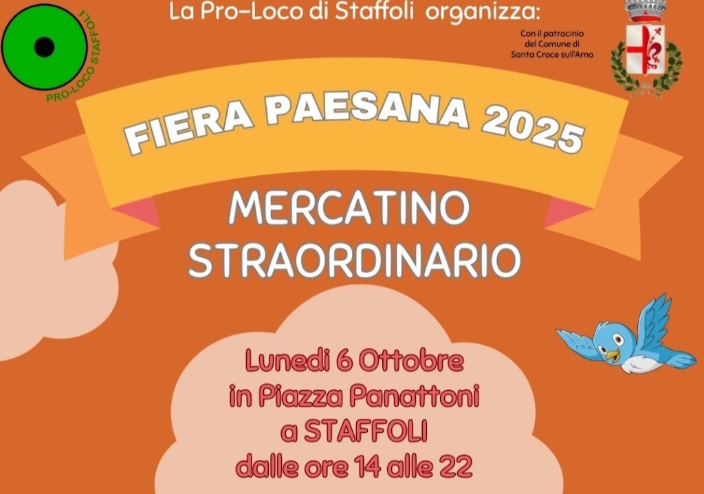 Torna per il 3° anno consecutivo la Fiera Paesana organizzata da Proloco Staffoli. Quest'anno tante novità, attrazioni per bambini, gonfiabili, salterello e giocattoli. Laboratori educativi sull'ambiente e del legno dalle 16.00 e alle 17.00 fino alle 19.00 ci sarà l'educatrice/ animatrice per giocare ed imparare divertendosi. Per i più grandi Tiro a segno gonfiabile. Non mancheranno i brigidini, i bomboloni e il track food, lampredotto, porchetta e cibo Messicano accompagnati da birra artigianale locale. Al mercatino potrete trovare prodotti artigianali.