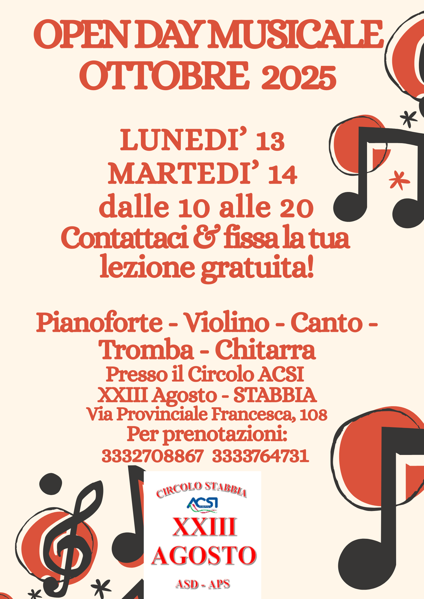 L'eccellenza della Musica è a Stabbia! Dopo i vari successi e riconoscimenti ottenuti dagli Allievi presso il Conservatorio Pietro Mascagni di Livorno ed in occasione del IV Concorso Europeo Benvenuto Busoni 2025, il Progetto Musicale Ferruccio Benvenuto Busoni si conferma centro professionale e di qualità nell'ambito della pratica e della didattica musicale. Open Day quindi nei giorni 13 e 14 ottobre dalle 10 alle 20 presso il Circolo ACSI XXIII Agosto di Stabbia per incontri e lezioni gratuite con i futuri musicisti interessati ad intraprendere un valido percorso musicale con Docenti altamente qualificati. Il Maestro Alessio Cioni è Responsabile del prestigioso Progetto: nato ad Empoli ha cominciato lo studio della musica e del pianoforte all'età di cinque anni sotto la guida della Prof.ssa Giulia Ninci.Nel 1993 è stato ammesso al Conservatorio e,sotto la guida del M° Enrico Stellini,si è diplomato nel 1999 col massimo dei voti,la lode e la menzione d'onore presso l'Istituto Musicale Pareggiato "R. Franci" di Siena.Subito dopo,su iniziativa dell' Istituto,si è esibito al Teatro de' Rozzi di Siena,riscuotendo un grande successo di pubblico. Ha partecipato a numerosi Concorsi Nazionali per giovani pianisti ottenendo sempre ottimi riconoscimenti da parte delle commissioni giudicatrici. E' risultato vincitore ai Concorsi di Biella (1991) con premio per la migliore interpretazione,Camaiore (1993),Osimo (1994), Pistoia (1998),Cesenatico (1999,Premio "E.Calugi"),Gabicce (1999), Fusignano (2007),Vicopisano (2008),Riviera della Versilia (Musica da Camera,2008).