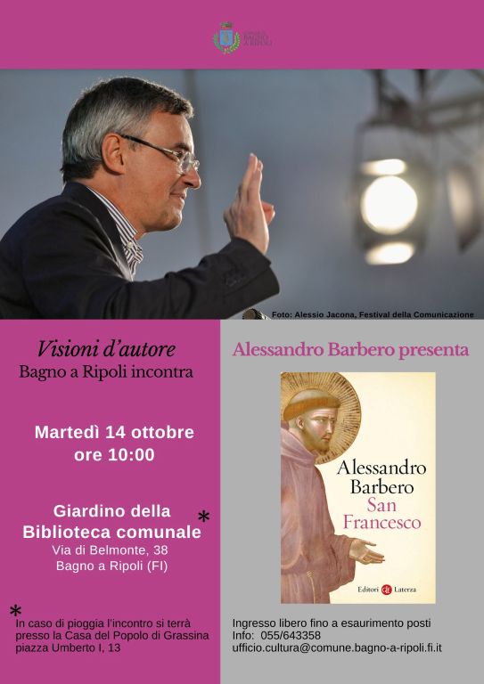L’incontro con Barbero rientra nella rassegna culturale “Visioni d’autore”, ideata e promossa dal Comune di Bagno a Ripoli. Nel suo nuovo volume, Barbero offre un ritratto originale e documentato di Francesco d’Assisi, restituendo l’immagine di un uomo concreto e complesso, capace di parlare al suo tempo e al nostro, a quasi 800 anni dalla morte. Con il rigore scientifico dello storico e uno stile divulgativo coinvolgente, l’autore racconta la vita del santo all’interno del contesto politico, economico e religioso dell’Italia medievale, mettendo in luce il significato profondo della sua rivoluzione spirituale.