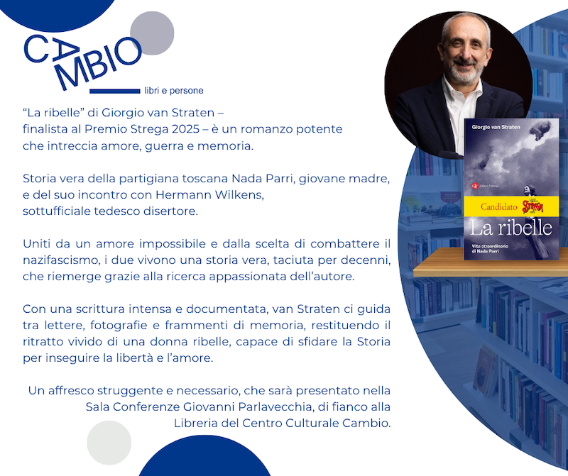Ad aprire la serie sarà Giorgio van Straten, autore, traduttore e figura di spicco della cultura italiana, con il suo romanzo “La ribelle. Vita straordinaria di Nada Parri”, selezionato tra i titoli più significativi del Premio Strega 2025. Van Straten, già direttore dell’Istituto Italiano di Cultura di New York e attuale presidente della Fondazione Alinari per la Fotografia, offrirà al pubblico un’occasione unica per immergersi nella sua narrazione intensa e vibrante.