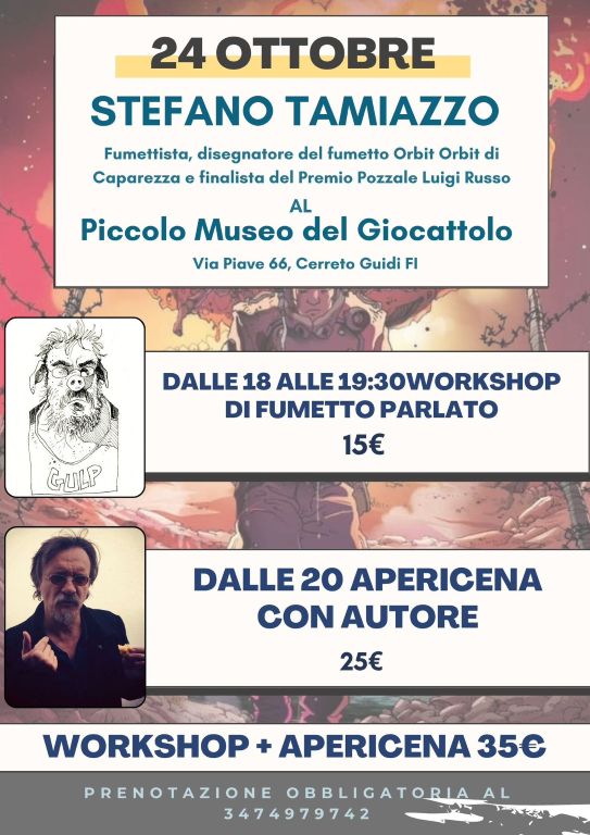 Doppio appuntamento giovedì 24 ottobre al Piccolo Museo del Giocattolo con Stefano Tamiazzo, autore, disegnatore e colorista di fumetti di fama internazionale. Direttore creativo di Mind Academy e collaboratore dell’Università di Padova, terrà un workshop di fumetto parlato dalle ore 18 alle 19.30, seguito alle 20 da un’apericena in compagnia dell’autore all'Home Restaurant di Cerreto Guidi.