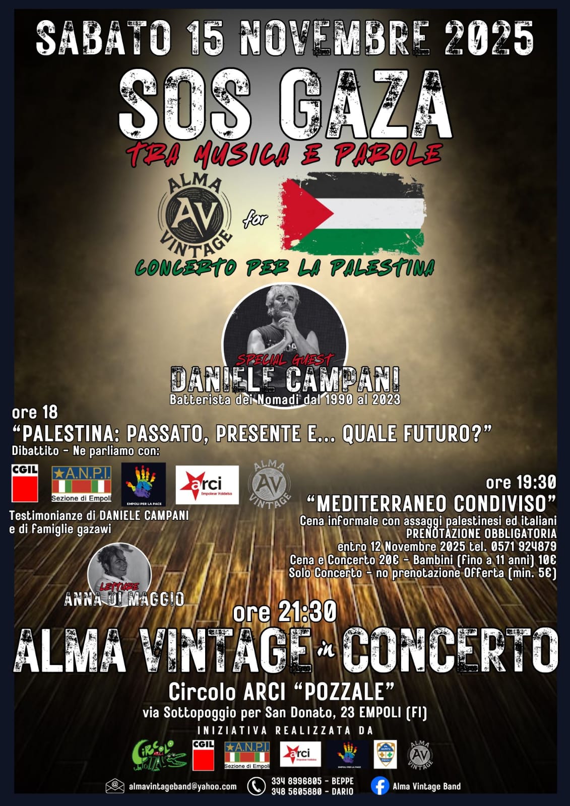Dibattito, letture, cucina e un concerto con gli ALMA VINTAGE e DANIELE CAMPANI, batterista dei Nomadi dal 1993 al 2023. L'appuntamento è organizzato da Circolo Arci Pozzale, Cgil Empolese Valdelsa, CGIL Toscana, Anpi Empoli, Arci Empolese Valdelsa, Pubbliche Assistenze Empoli, Empoli Per la Pace e la band Alma Vintage.