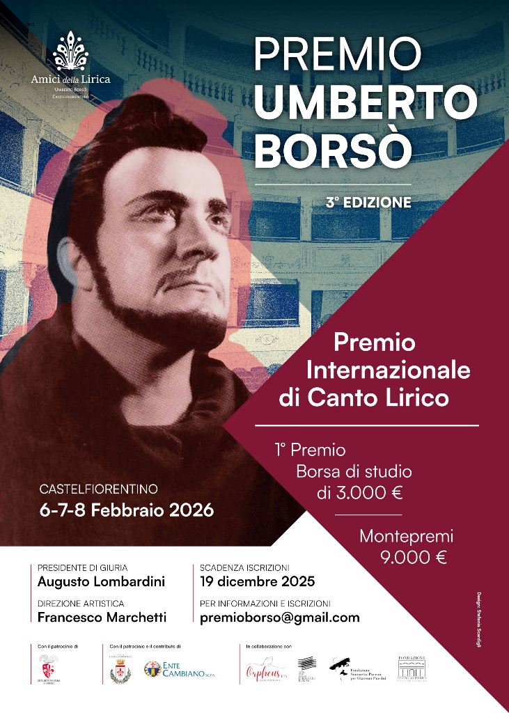 Il Premio – promosso dall’associazione “Amici della Lirica Umberto Borsò” – gode del patrocinio della Città Metropolitana di Firenze e del Comune di Castelfiorentino, dell’Ente Cambiano (e con il contributo di questi ultimi due) ed è realizzato in collaborazione con l’Associazione “Orpheus”, il Centro Studi Musicali “Ferruccio Busoni” e la Fondazione “Simonetta Puccini per Giacomo Puccini”.