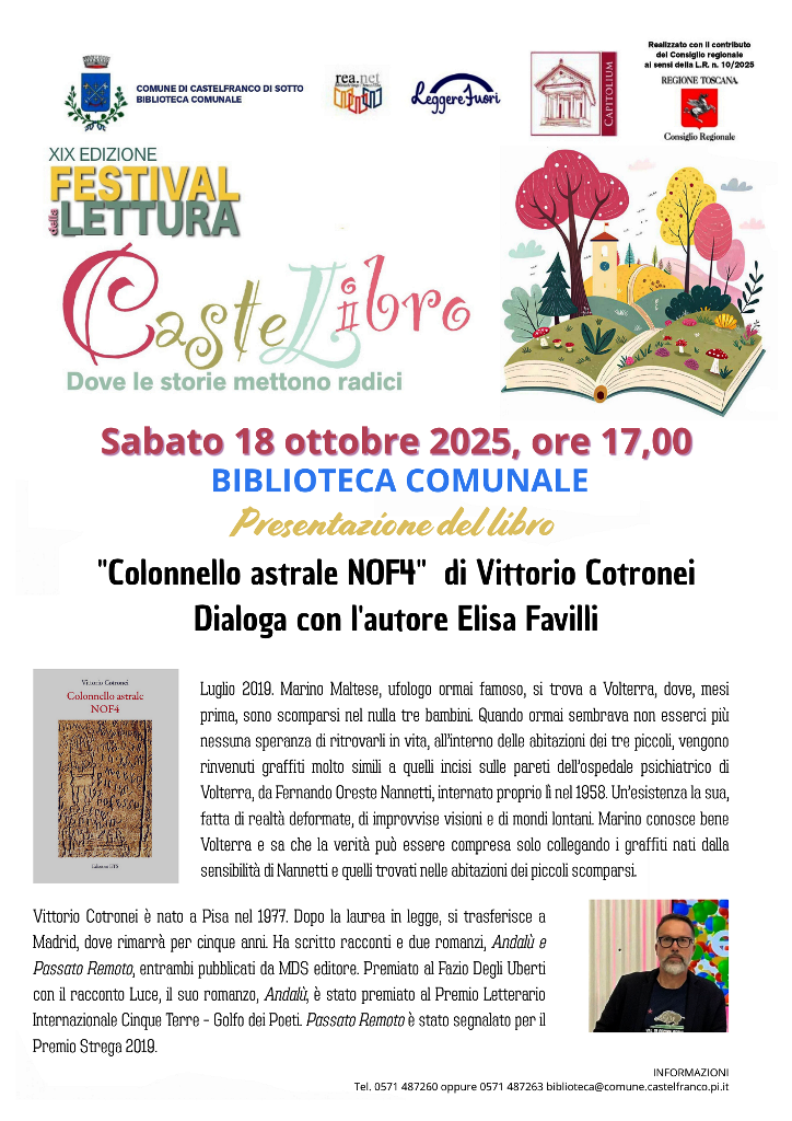 La 19esima edizione del Festival della Lettura di Castelfranco di Sotto, edizione 2025, che prenderà il via sabato 18 ottobre, porta con sé varie novità in termini di nomi e di iniziative e di impostazione culturale. La prima è il nome, che si arricchisce del sottotitolo “Castelibro, dove le storie mettono radici”. Il festival aumenta anche il numero di giorni di attività, confermando e rafforzando la vocazione della manifestazione a essere in primo luogo un momento di avvicinamento alla lettura per i più piccoli, ma anche per i più grandi. Un'iniziativa diventata sempre più importante nel panorama culturale locale, soprattutto come momento in cui la lettura e l'editoria vengono presentate come esperienze vive e fruibili da tutti.