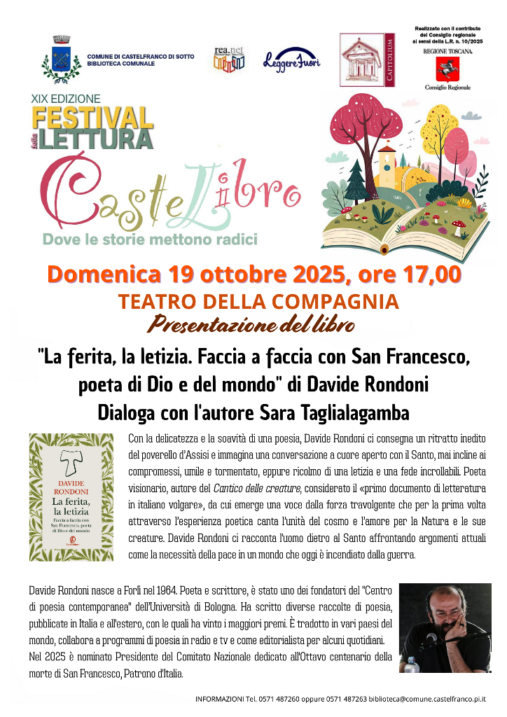Domenica 19 ottobre invece alle 17 sarà la volta, al Teatro della Compagnia, dell'incontro con Davide Rondoni, poeta scrittore e drammaturgo italiano che ha ottenuto svariati riconoscimenti. L'incontro parlerà attraverso il libro di Rondoni di San Francesco, il santo più famoso e forse apprezzato d'Italia, non solo come uomo di fede, ma anche come figura di intellettuale del '200. Un momento che avrà come tema il titolo del libro: “La ferita, la letizia. Faccia a faccia con San Francesco, poeta di Dio e del mondo”. A condurre la giornata di riflessione su San Francesco con Rondoni sarà Sara Taglialagamba.