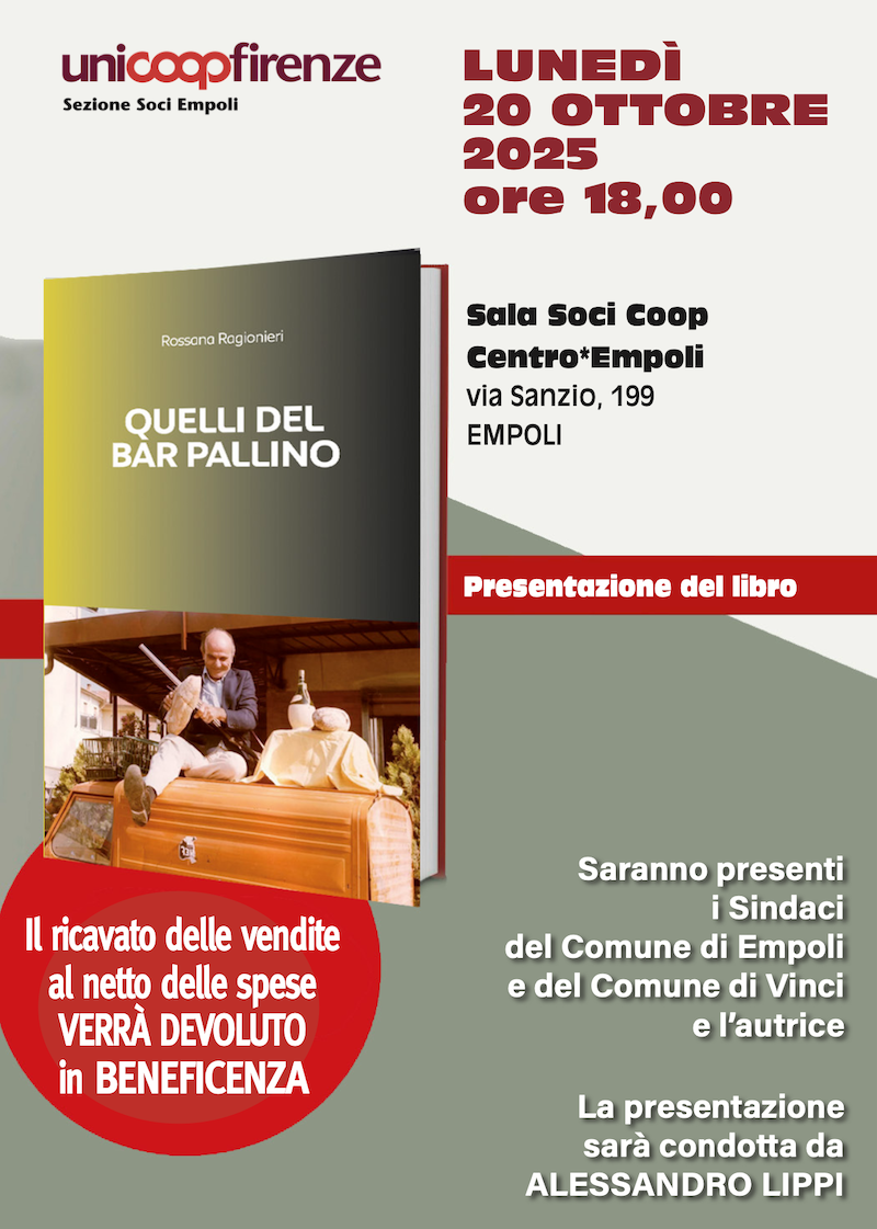 Una storia che si intreccia con le evoluzioni del tempo, con il contesto sociale del territorio, che molti nell’Empolese ricordano o hanno vissuto. Un’epoca passata da riscoprire lunedì 20 ottobre, alle 18 nella sala soci Coop del Centro*Empoli in via Sanzio, con la presentazione del libro: a parlarne saranno l’autrice, i frequentatori dello storico bar, con la partecipazione anche dei sindaci di Empoli e Vinci, Alessio Mantellassi e Daniele Vanni, e la conduzione di Alessandro Lippi. All’incontro sarà possibile acquistare il libro, così come nelle edicole: il ricavato sarà devoluto in beneficenza.