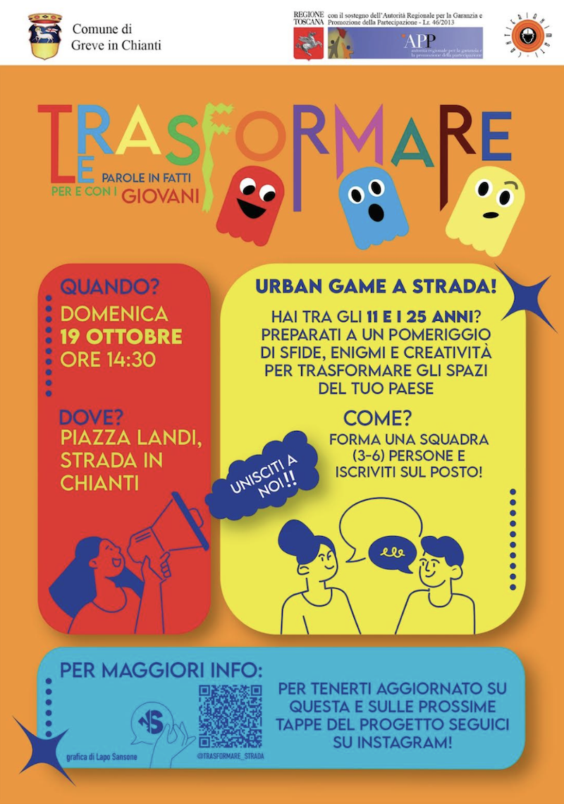 Un’esperienza immersiva e dinamica, organizzata in uno spazio urbano, che stimola autonomia, gioco di squadra e invita i partecipanti a sciogliere enigmi e scoprire luoghi, segreti nascosti tra piazze, angoli e vie del proprio paese. A Strada in Chianti approda l’“Urban Game”. Il Comune chiama a raccolta i giovani della frazione per coinvolgerli in un percorso giocoso e divertente allestito in piazza Landi. È la prima tappa di un viaggio partecipativo rivolto alle ragazze e ai ragazzi di età compresa tra gli 11 e i 25 anni. “Trasformare le parole in fatti, per e con i giovani” è il titolo e l’obiettivo del progetto promosso dall’assessora alla Partecipazione Monica Toniazzi e l’assessora alle Politiche giovanili Ilary Scarpelli, sostenuto dell’Autorità regionale per la promozione partecipazione della Toscana.