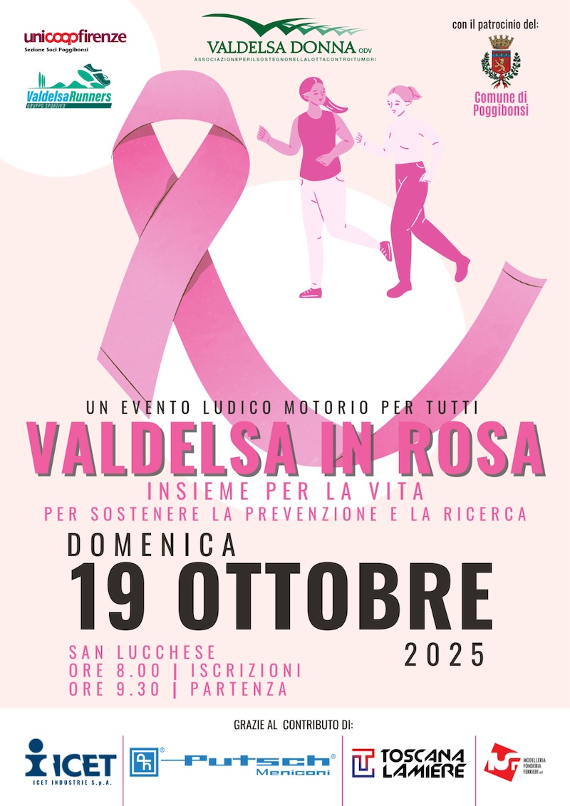 “Valdelsa in rosa” è una manifestazione podistica, una passeggiata ludico motoria aperta a tutti e tutte per le vie di Poggibonsi. Un evento che si colloca all’interno delle iniziative dell’Ottobre Rosa, mese destinato alla sensibilizzazione e alla prevenzione del tumore al seno.
