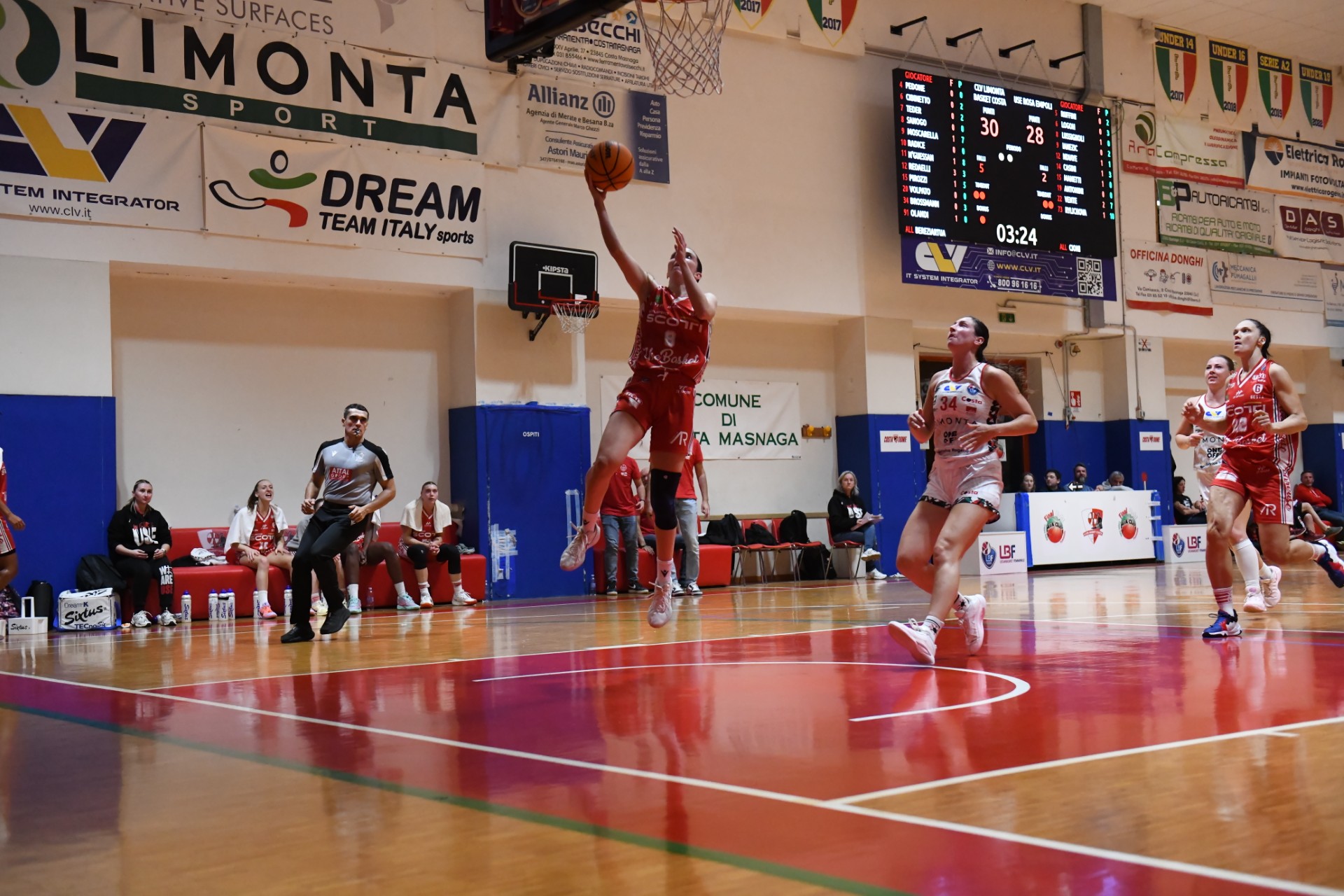 La Scotti vuol chiudere bene, schizza sul 32-38 ma Costa non molla e così si va a riposarsi sul 39-38 con la tegola del terzo di Vente in attacco. Brosmann e Lussignoli subito a segno in un inizio che vede Costa allungare sul più 8: 51-43. Le folate della squadra di casa continuano ad essere un problema e così arriva il meno 10: 53-43. La solita Rylichova prova a metterci una toppa e coach Cioni rimette dentro Vente per dare profondità al gioco. Lussignoli riavvicina la Scotti che però fatica a rientrare in una partita che pare scivolarle piano piano fra le mani: 61-49. La vena realizzativa di Rylichova non può bastare e così al 30’ siamo 68-52, con un terzo tempino vissuto sempre in affanno come dimostra il 29-14 di parziale. Manetti ritrova lo smalto dei vecchi tempi con 7 punti consecutivi (73-59) ma si fatica ad immaginare come l’Use Rosa possa rimettere in piedi la baracca. Lussignoli ci prova col 73-64 aprendo la fase dell’ora o mai più. Non entrano due triple che avrebbero ridato morale ad una squadra che ha comunque il merito di non mollare mai. A Costa basta gestire per chiudere sull’87-74. Niente da dire, giusto così.
