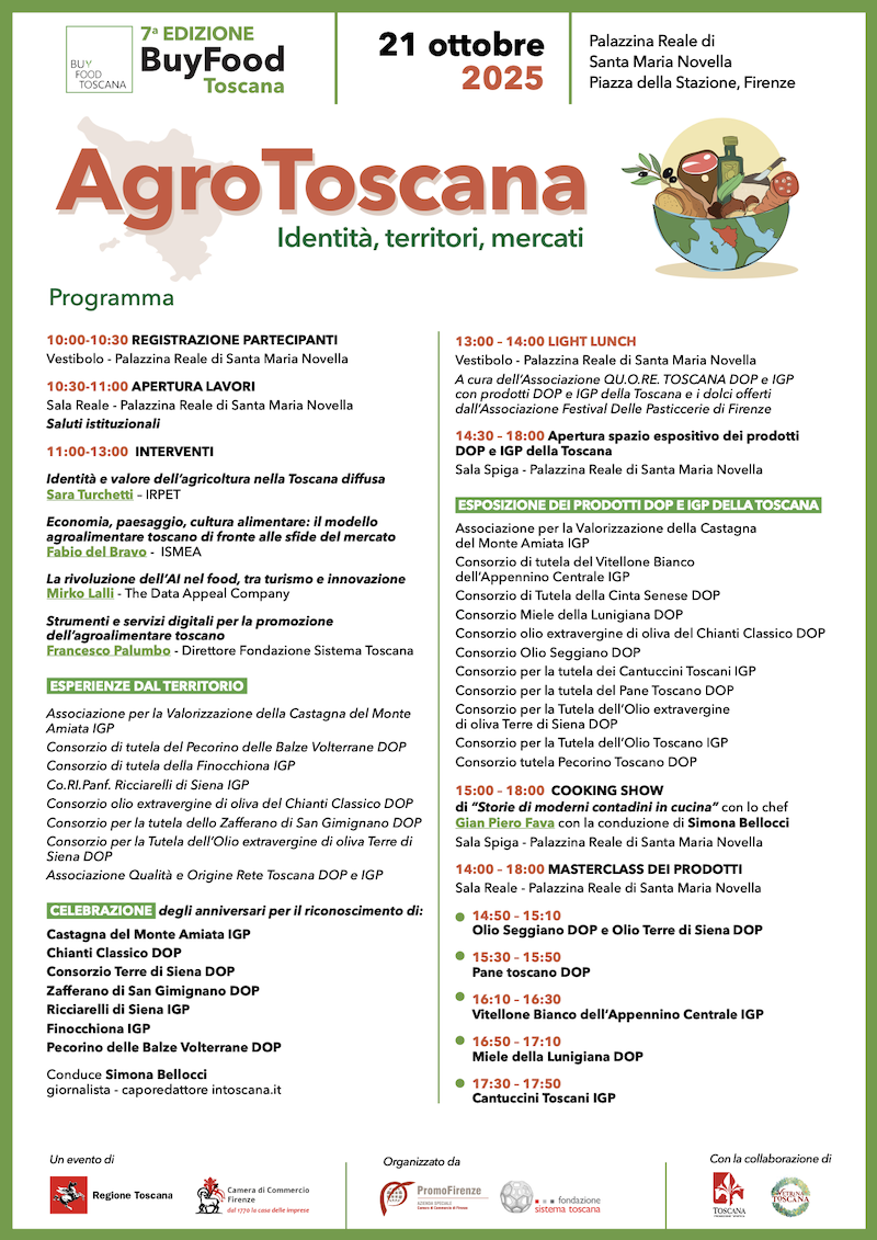 L’evento di inaugurazione della settimana di eventi dedicati alle eccellenze del food è in programma martedì 21 ottobre con “AGROTOSCANA. Identità, territori e mercati”, il workshop che si svolgerà presso la Palazzina Reale a Firenze. Gli appuntamenti proseguono poi con gli incontri BtoB di BuyFood Toscana il 22 e 23 ottobre presso il Palazzo degli Affari di Firenze, per terminare con i tour sul territorio dedicati a buyer e stampa di settore. La food week di BuyFood Toscana 2025 è promossa da Regione Toscana e Camera di Commercio di Firenze, organizzata da Fondazione Sistema Toscana e PromoFirenze. L'evento, si avvale della sinergia di Vetrina Toscana, il progetto regionale che promuove il turismo enogastronomico.