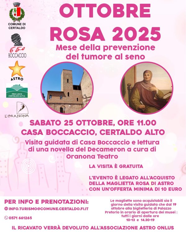 In occasione di Ottobre Rosa il Comune di Certaldo offrirà una visita guidata gratuita a Casa Boccaccio con lettura di una novella. Appuntamento il 25 ottobre con ritrovo alle ore 10:30 a Palazzo Pretorio. Sarà possibile acquistare la maglietta solidale di ASTRO, il cui ricavato andrà a sostegno delle attività dell’associazione.