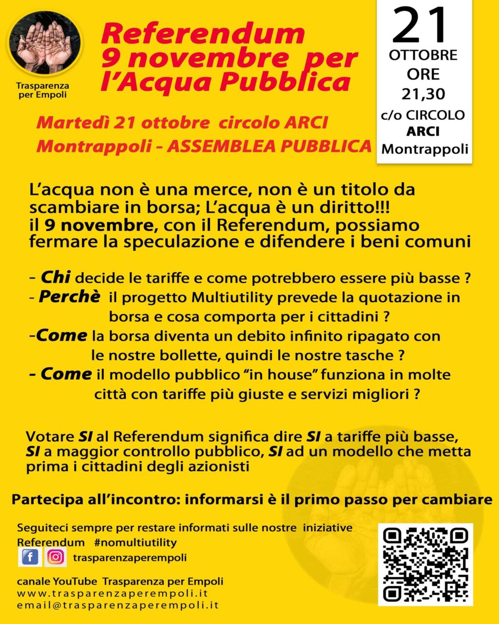 “L’acqua non è una merce, è un diritto”: con questo slogan si apre l’assemblea pubblica promossa da Trasparenza per Empoli, in programma questa sera al Circolo Arci di Montrappoli, in vista del referendum comunale del 9 novembre 2025 sull’acqua pubblica.