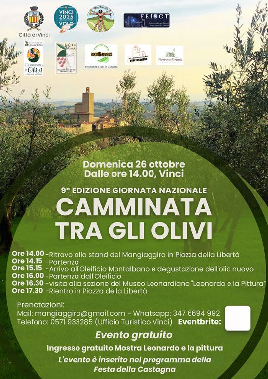 Nell’ambito della Festa della castagna, in programma domenica 26 ottobre a Vinci, la 9ª edizione della Giornata nazionale della Camminata tra gli olivi, la manifestazione è ideata appositamente per esaltare il prodotto di stagione, ovvero l’olio novo, oltre che per godere del paesaggio autunnale leonardiano.