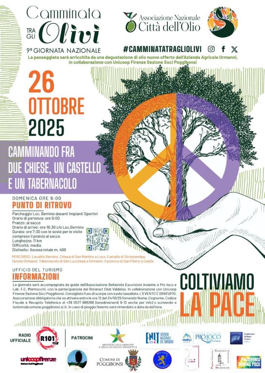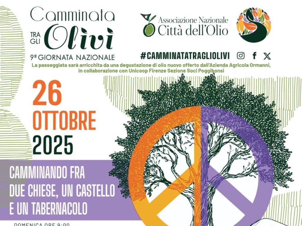 Domenica 26 ottobre è in programma un itinerario speciale costruito dal Comune per la nona Giornata Nazionale della “Camminata fra gli Olivi” promossa dalle Città dell’Olio di cui Poggibonsi fa parte, e che si colloca anche nell’ambito dei percorsi in occasione del Giubileo 2025.