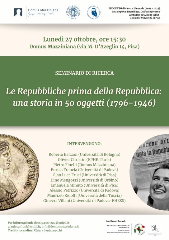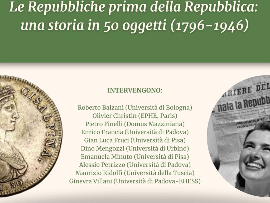 Lunedì 27 ottobre 2025 alle ore 15:30 presso la Domus Mazziniana, a Pisa, si svolgerà un seminario di ricerca dal titolo “Le Repubbliche prima della Repubblica: una storia in 50 oggetti (1796-1946)”. All’incontro interverranno Roberto Balzani (Università di Bologna), Olivier Christin (EPHE, Paris), Pietro Finelli (Domus Mazziniana), Enrico Francia (Università di Padova), Gian Luca Fruci (Università di Pisa), Dino Mengozzi (Università di Urbino), Emanuela Minuto (Università di Pisa), Alessio Petrizzo (Università di Padova), Maurizio Ridolfi (Università della Tuscia), Ginevra Villani (Università di Padova - EHESS).
