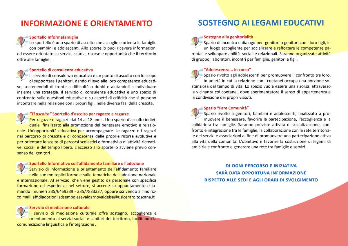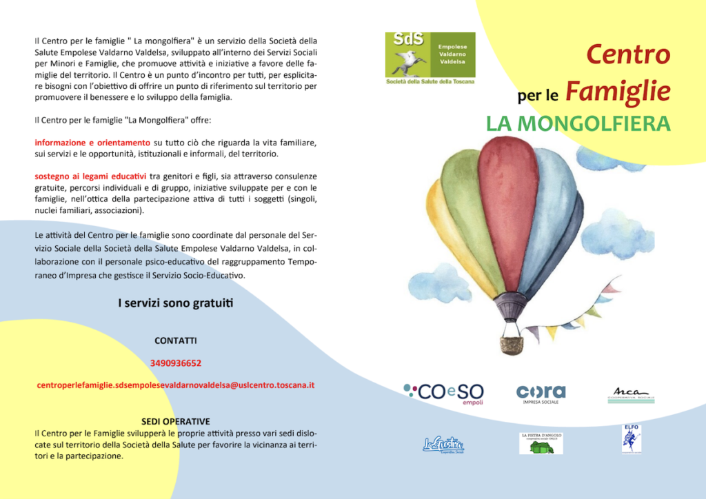 Un sostegno alla genitorialità, e ai rapporti talvolta problematici tra genitori e figli. Ma anche uno sportello di ascolto dedicato, per ragazzi e ragazze dai 14 ai 18 anni. È questo, in estrema sintesi, il biglietto da visita de “La Mongolfiera”, un servizio completamente gratuito messo a disposizione dalla Società della Salute Empolese Valdarno Valdelsa per promuovere il benessere e lo sviluppo delle famiglie.