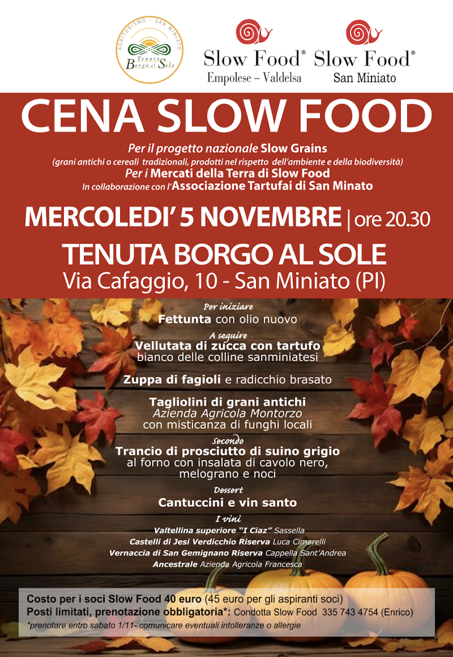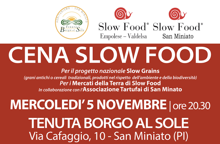 Una cena per valorizzare tradizioni e prodotti locali e sostenibili. A organizzarla sono le Condotte Slow Food Empolese Valdelsa e San Miniato mercoledì 5 novembre, alla tenuta Borgo al Sole a San Miniato (altri dettagli e menù nella locandina). La cena, spiegano dalle Condotte Slow Food, sarà dedicata a tre principali temi: