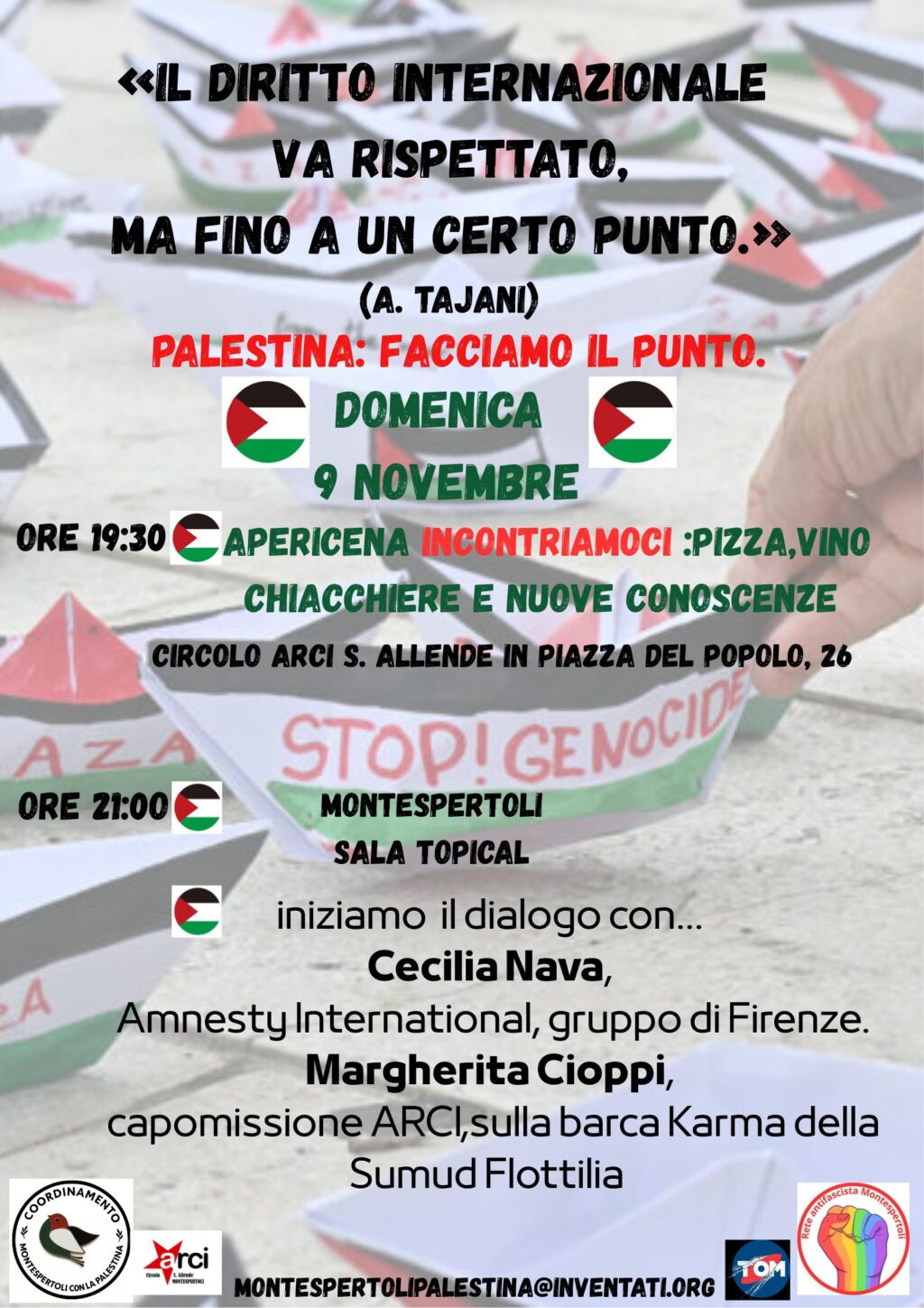 “Il diritto internazionale va rispettato, ma fino a un certo punto? Noi crediamo che i diritti umani non abbiano confini". Con questo messaggio domenica 9 novembre a Montespertoli si terrà una serata di approfondimento e sensibilizzazione dedicata alla tutela dei diritti umani e alla situazione in Palestina, in un momento storico segnato da tensioni internazionali e crescente attenzione civile.