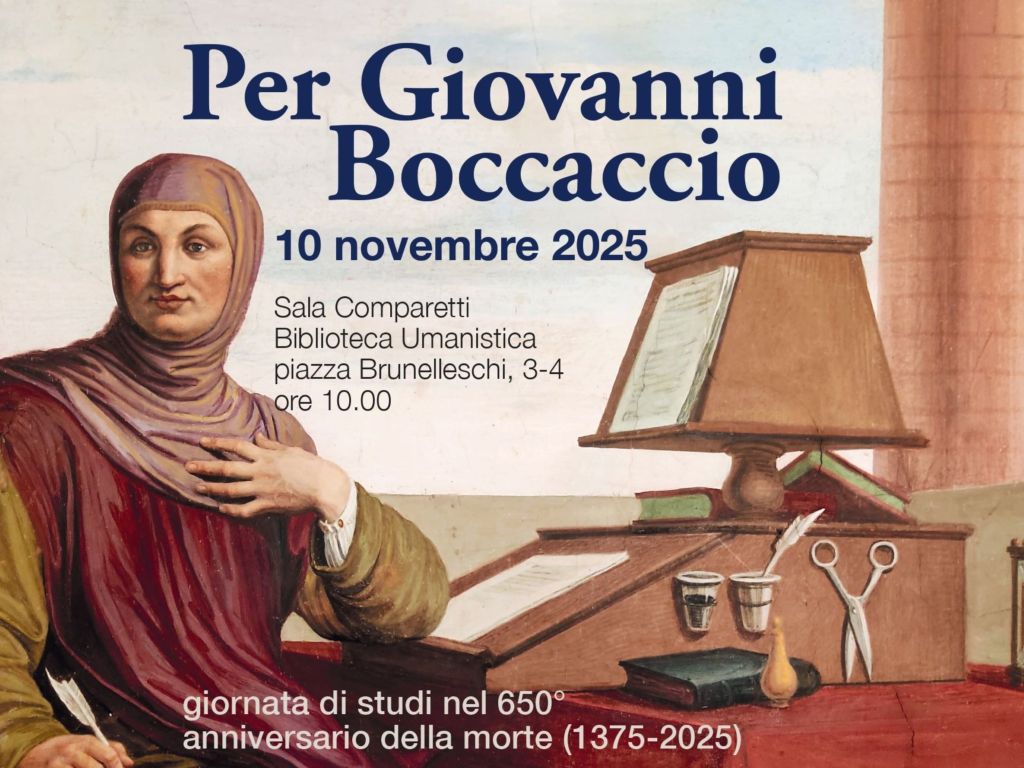 Si terrà venerdì 10 novembre, presso la Sala Comparetti dell’Università di Firenze, ore 10, ingresso libero, la giornata di studi intitolata “Per Giovanni Boccaccio”, promossa dall’Ente Nazionale Giovanni Boccaccio in collaborazione con il Dipartimento di Lettere e Filosofia dell’Ateneo fiorentino, che intende così celebrare il 650° anniversario della morte del grande scrittore del Trecento.