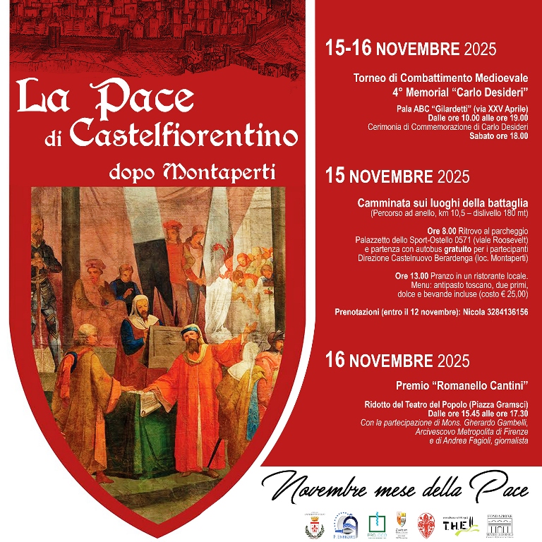 “Il prossimo fine settimana – osserva l’Assessore alla Cultura, Franco Spina – è in programma l’avvio della rievocazione storica della Pace di Castelfiorentino, con una passeggiata sui luoghi dove avvenne la famosa battaglia tra Guelfi e Ghibellini, un torneo di combattimento medievale in memoria di Carlo Desideri e il Premio “Romanello Cantini. Fabbricanti di arcobaleni”, dedicato all’intellettuale castellano scomparso alcuni anni fa. Il corteo storico e la rievocazione della firma degli accordi di pace sono previsti quest’anno al mattino di sabato 22 novembre, mentre il pomeriggio sarà dedicato a un approfondimento del contesto storico e dei contenuti della Pace di Castelfiorentino, con un evento al Ridotto organizzato in collaborazione con la Società Storica della Valdelsa. Avremo modo di approfondire nei prossimi giorni i contenuti di ogni singola iniziativa”
