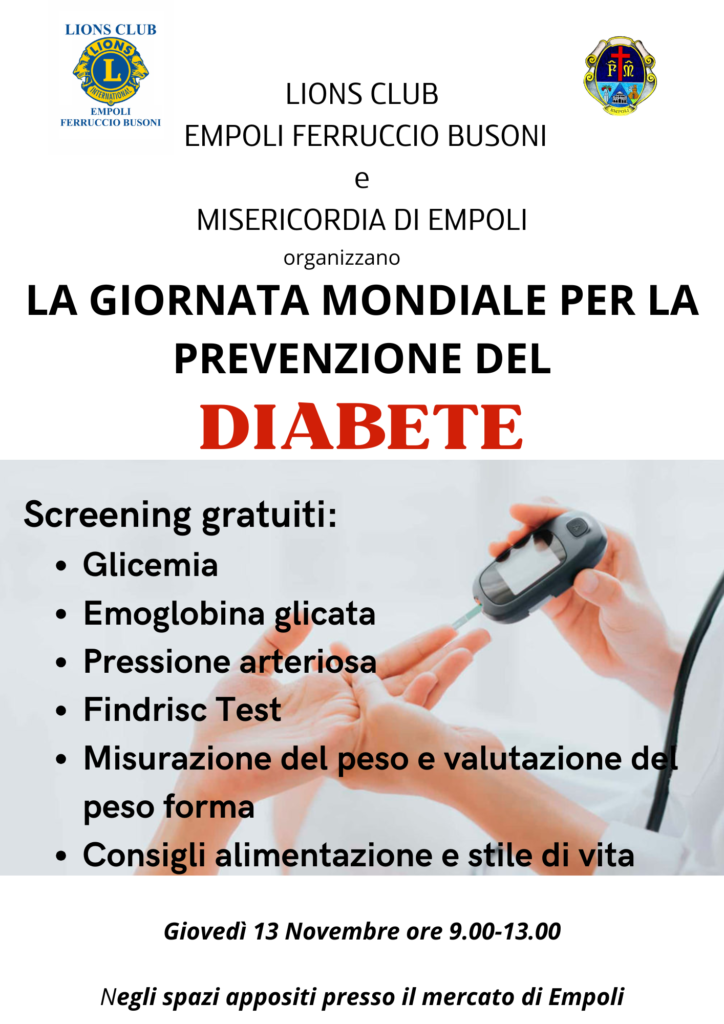 Una giornata dedicata alla prevenzione del diabete si terrà mercoledì 13 novembre al mercato di Empoli, su iniziativa del Lions Club Empoli “Ferruccio Busoni”, in collaborazione con la Misericordia di Empoli.