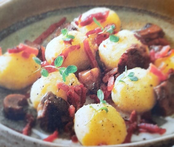 Sfere di patate con taleggio, funghi porcini e speck
