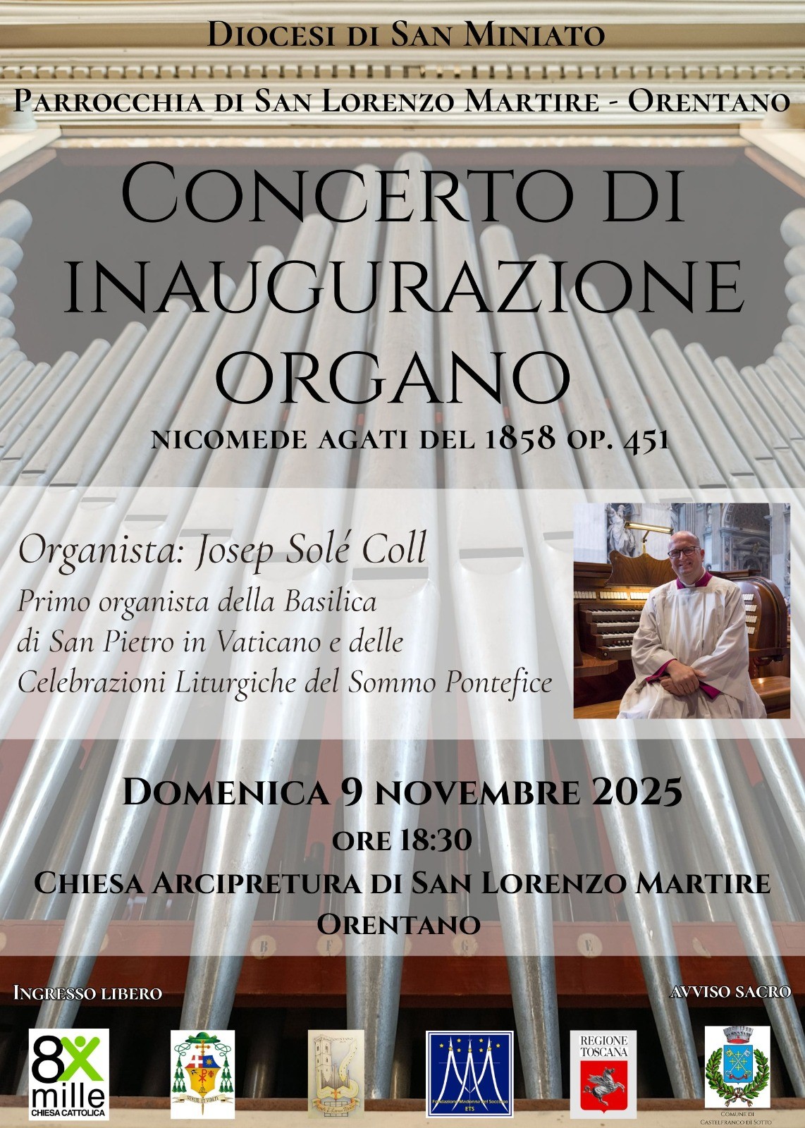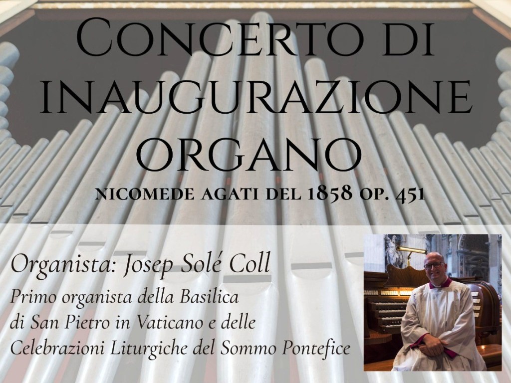 Per celebrare questo importante traguardo 9 18.30 di terrà il Concerto di inaugurazione tenuto da m° Josep Solé Coll, primo organista della Basilica di San Pietro in Vaticano e delle Celebrazioni Liturgiche del Sommo Pontefice.