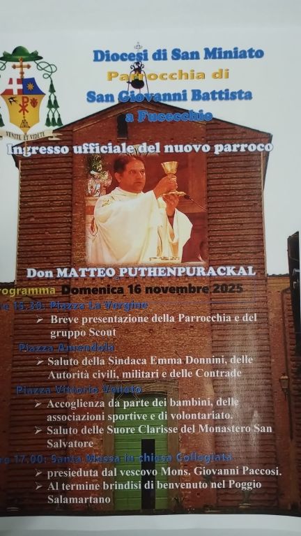 La comunità parrocchiale di S. Giovanni Battista a Fucecchio si prepara a vivere un momento di grande gioia e fraternità: l'arrivo del nuovo parroco Don Matteo Puthenpurackal, che arriverà a sostituire Don Andrea Pio Cristiani, andato in pensione. Domenica prossima, 16 novembre, saremo pronti ad accoglierlo e a festeggiare colui che monsignor Vescovo ha scelto di mettere al servizio del Vangelo e della comunità fucecchiese.