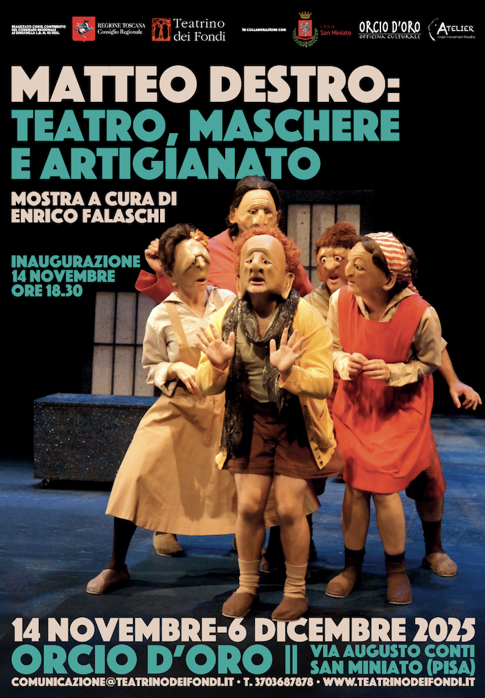 Venerdì 14 novembre alle ore 18:30, presso l’Orcio d’Oro, in via Augusto Conti a San Miniato, sarà inaugurata la mostra Matteo Destro: Teatro, Maschere e Artigianato, alla presenza dell’artista Matteo Destro, del curatore e direttore artistico del Teatrino dei Fondi, Enrico Falaschi, del Sindaco del Comune di San Miniato, Simone Giglioli, dell’Assessore alla Cultura del Comune di San Miniato, Matteo Squicciarini.