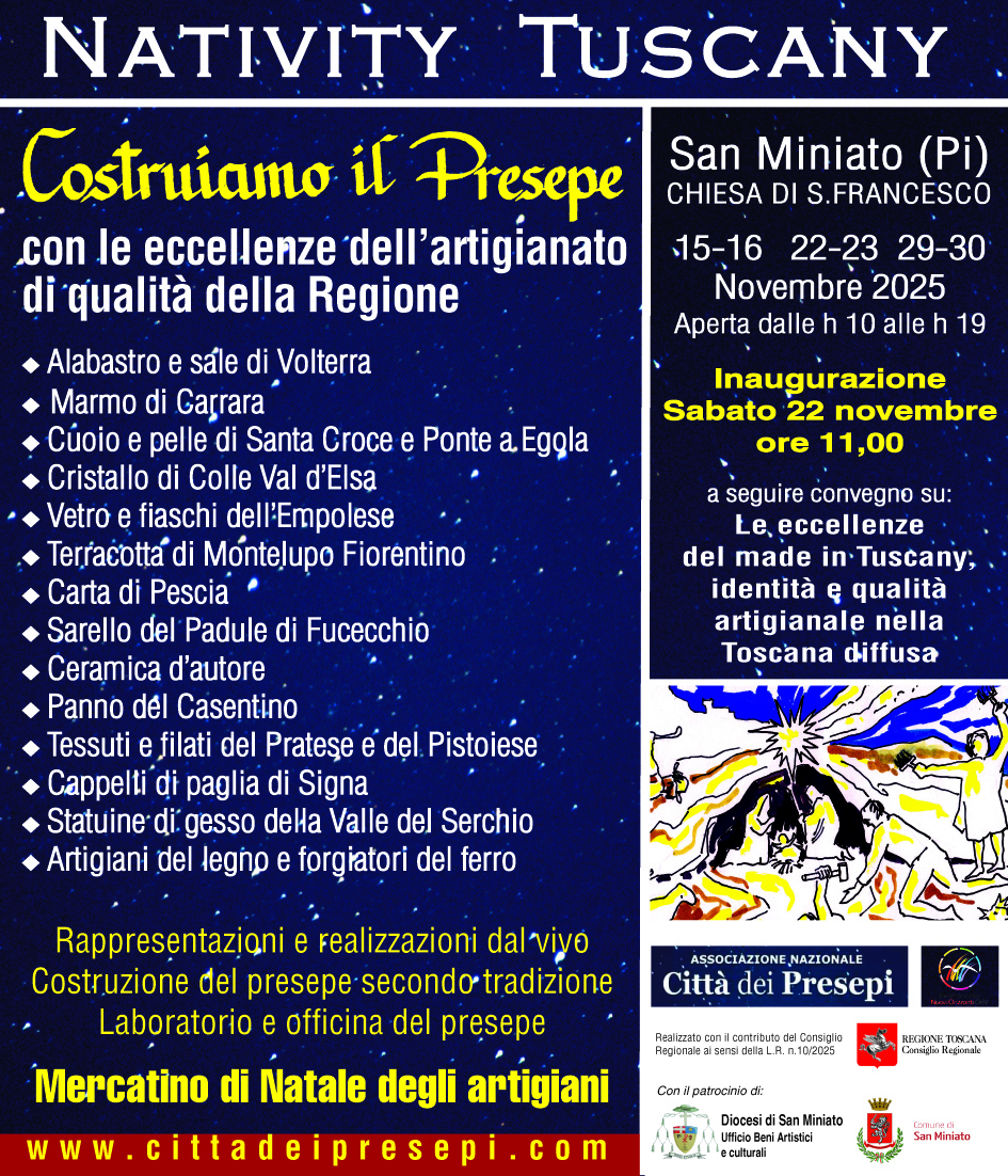 L’iniziativa si inserisce nel percorso che l’associazione nazionale Città dei Presepi propone per evidenziare gli anniversari ottocentenari francescani: il 2025 è caratterizzato infatti dal Cantico delle Creature e il 2026 dall’ascesa al cielo di San Francesco. Nativity Tuscany è realizzato attraverso la partecipazione al bando pubblicato dal Consiglio Regionale della Toscana per la valorizzazione dell’artigianato di qualità e viene realizzato in collaborazione con Nuovi Orizzonti e l’Ufficio Beni Artistici e Culturali della Diocesi di San Miniato con il patrocinio del Comune di San Miniato. Nativity Tuscany è aperta dalle ore 10 alle ore 19 da sabato 15 novembre a domenica 30 novembre nei fine settimana. Tutti sono invitati a partecipare. www.cittadeipresepi.com