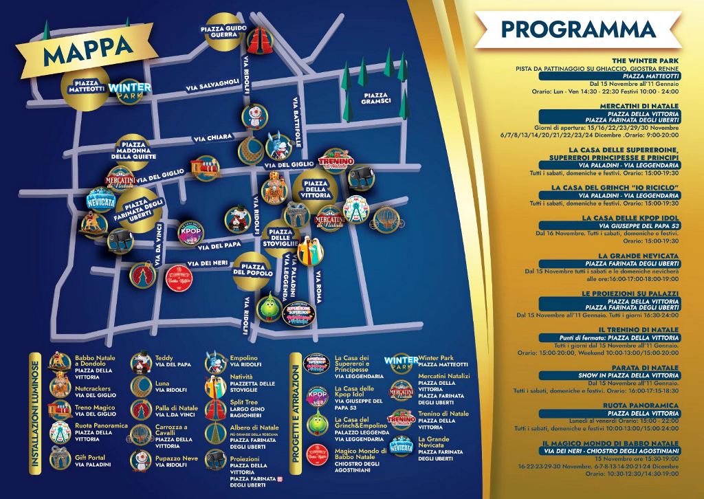 Tra piazza della Vittoria e piazza Farinata degli Uberti ritornano i Mercatini di Natale con 70 baite allestite fino al 24 dicembre, mentre in piazza Matteotti è allestita la Pista di Pattinaggio su Ghiaccio con la Giostra delle Renne.