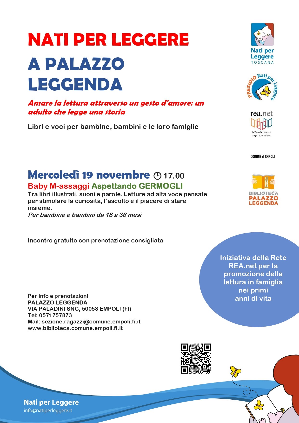 Si comincia domani, mercoledì 19 novembre 2025, alle 17 per il ciclo e per la settimana di Nati per Leggere con i Baby M-assaggi di ‘Aspettando Germogli’, tra libri illustrati, suoni e parole. Letture ad alta voce pensate per stimolare la curiosità, l’ascolto e il piacere di stare insieme. Prenotazione consigliata. (Attività da 18 a 36 mesi).