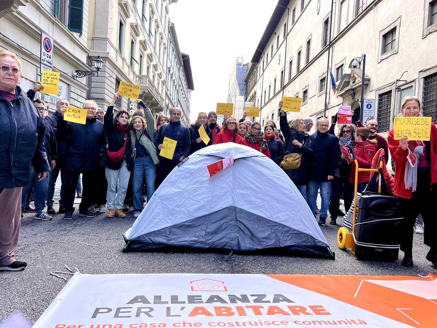 Presidio e flash mob stamattina davanti alla prefettura di Firenze per denunciare l’aggravarsi dell’emergenza abitativa in città. L’iniziativa, promossa dall’Alleanza per l’Abitare, ha visto anche la simbolica presenza di una tenda da campeggio montata in strada.