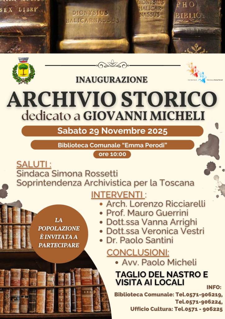 L’inaugurazione è prevista nella mattinata di Sabato 29 novembre, a conclusione di alcuni interventi previsti presso la Biblioteca “Emma Perodi” dove alle ore 10,00 la Sindaca Simona Rossetti porterà i saluti dell’Amministrazione comunale. Subito dopo prenderanno la parola l’Arch. Lorenzo Ricciarelli, il Prof. Mauro Guerrini, la Dott.ssa Vanna Arrighi, la Dott.ssa Veronica Vestri e il Dr. Paolo Santini, mentre le conclusioni saranno affidate all’avvocato Paolo Micheli, figlio di Giovanni, a cui l’archivio verrà intitolato.