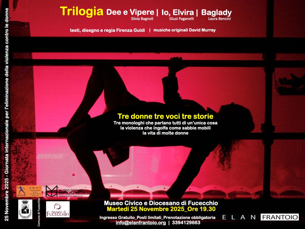È così che Firenza Guidi introduce l’evento che marca il 26esimo anniversario della Giornata internazionale per l'eliminazione della violenza contro le donne, ricorrenza istituita dall'Assemblea generale delle nazioni unite il 17 dicembre 1999. Il programma della serata, fortemente voluto dall’Amministrazione del Comune di Fucecchio, prevede una trilogia di grande rilievo artistico: tre atti unici inediti che portano la firma della Guidi, come autrice o traduttrice.