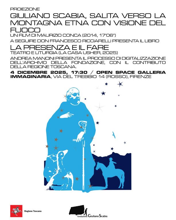 Il 4 dicembre, alle 17.30, presso l’Open Space Galleria Immaginaria in via Trebbio a Firenze, verrà proiettato il film Giuliano Scabia, salita verso la montagna Etna con visioni del fuoco, di Maurizio Conca.