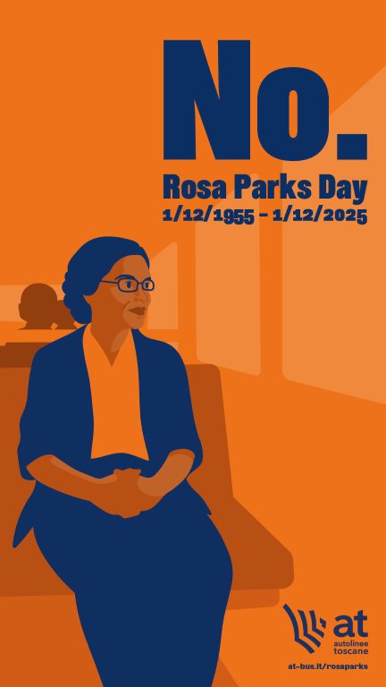 Quel NO rivoluzionario, oggi, a distanza di 70 anni, rivive nella campagna ideata da at-autolinee toscane per il Rosa Parks Day. Un’immagine forte e immediata: un grande “NO.” in caratteri blu su sfondo arancione, accompagnato dalla silhouette stilizzata di Rosa Parks seduta tranquilla su un autobus, anch’essa in blu. Un contrasto cromatico deciso che richiama l’energia del cambiamento e la potenza di un gesto semplice ma determinante. In basso, il logo di at-autolinee toscane e il link per approfondire: https://www.at-bus.it/it/rosaparksday.