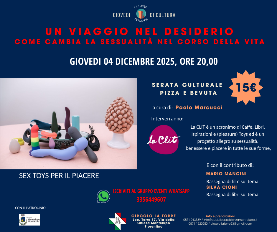 L’iniziativa fa parte della rassegna I Giovedì di Cultura e porta a Montelupo un ospite particolare: “La Clit”, realtà fiorentina che ha costruito un progetto culturale attorno al benessere sessuale, intrecciando caffè, libri, ispirazioni e pleasure toys di alta gamma. Un centro che lavora sul tema con uno stile limpido e rispettoso, volto a rendere la sessualità qualcosa di naturale e condivisibile, non un tabù o un terreno di imbarazzo.