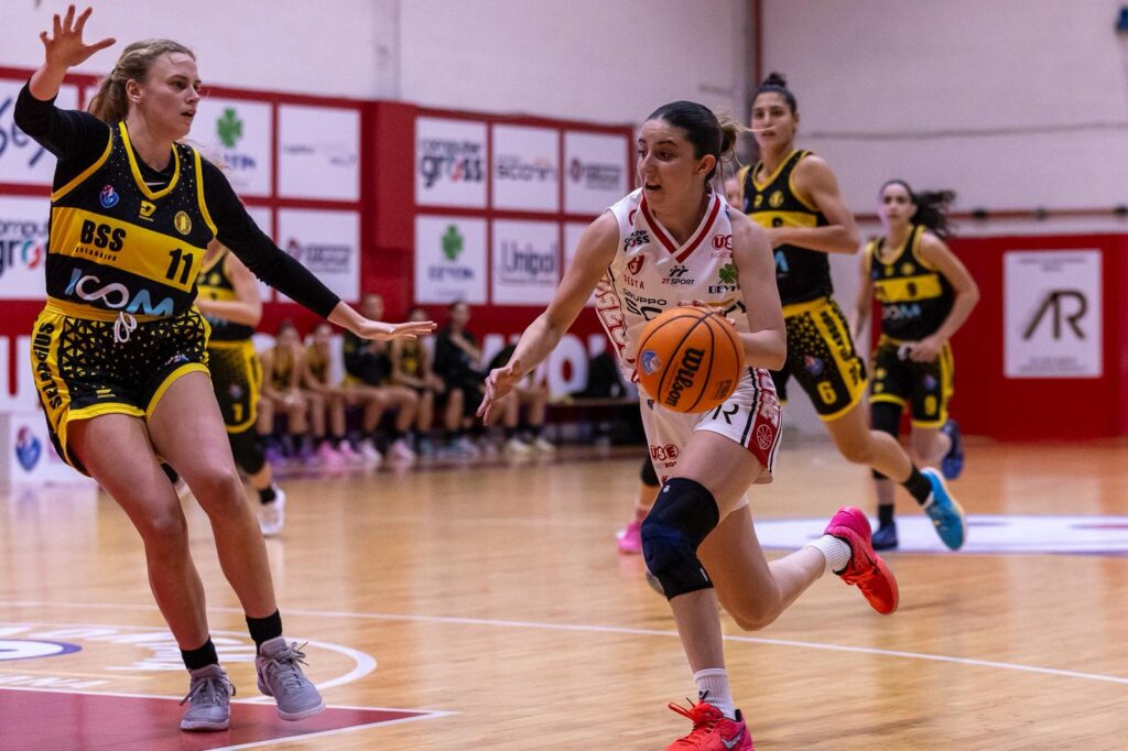 Lussignoli mette 6 dei primi 9 punti e Rylichova non le è da meno: 11-4. Qui c’è l’unico passaggio a vuoto delle biancorosse che subiscono un parziale di 0-7 che impatta il risultato: 11-11. Nonostante le sarde, prive di Juhasz, abbiano un paio di possessi per passare in vantaggio, la Scotti tiene comunque sempre la testa avanti senza sapere che, da lì in poi, non ci sarà più partita. Il 6-0 di parziale porta al 23-15 del minuto dieci e l’inizio del secondo tempino sarebbe già da titoli di coda: parziale di 16-0, più 24 (39-15) e primo canestro subito dopo 8 minuti. Tutto perfetto. In mezzo ai canestri di Ruffini, Ianezic, Manetti e Vente, c’è anche un ricamo di Casini, un assist che è una delizia per gli occhi dei tifosi ed un confetto per Manetti che appoggia comoda a canestro. Intanto Antonini martella dall’arco con la precisione di un chirurgo ed al riposo si va sul 44-23. Si riparte con Vente, una palla recuperata da Ruffini con canestro e 28: 51-23. Si fatica ad accorgersi del terzo fallo di Lussignoli e Vente perché in un amen siamo più 30 (55-25) con Casini che concede il bis con un altro assist ‘no look’ da applausi. E’ la stessa Scotti? Ci si chiede in tribuna mentre, dopo i canestri di Panchetti e Logoh, si scopre che tutte sono andate a segno lasciando a Casini dall’angolo la tripla del più 40: 86-46. Alla sirena 86-48. Ripetersi è piacevole: un’Use Rosa Scotti mai così bella.