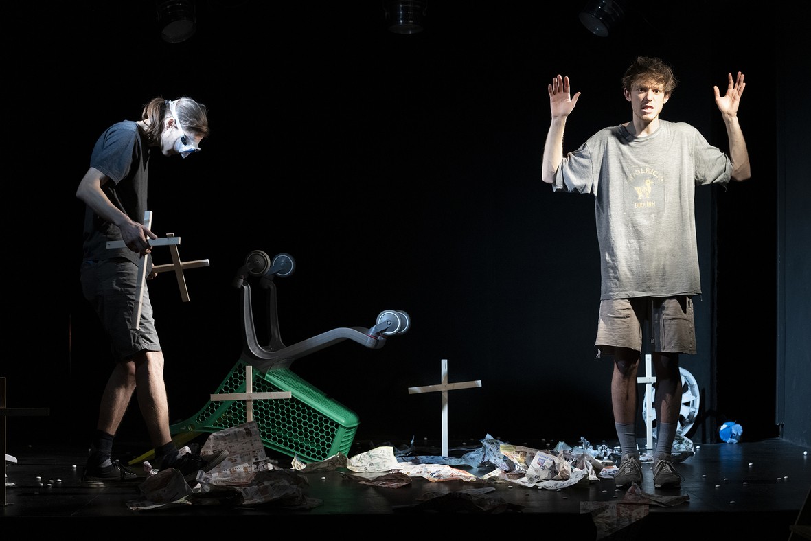 Venerdì 12 dicembre alle ore 21:30 è la volta di Niccolò Fettarappa e Lorenzo Guerrieri, straordinari giovani artisti, in scena con APOCALISSE TASCABILE, uno spettacolo pluripremiato che ha ottenuto notevole successo di pubblico. Un lavoro a doppiofondo che racconta la fine del mondo, ma è anche l’occasione per risvegliare quella “debole forza messianica” che secondo Benjamin si deposita in ogni generazione, in attesa d’essere portata alla luce per scardinare il mondo. Senza alcun preavviso, Dio compare in un supermercato in periferia di Roma e vi annuncia la fine del mondo. Per sua colpa e sfortuna, ad ascoltarlo c’è ben poca gente. A prenderlo sul serio c’è solo un giovanotto amorfo e sfibrato, da allora fatalmente destinato ad essere il profeta della fine dei tempi. Accompagnato da uno svogliato angelo dell’Apocalisse, il giovane apostolo si fa strada nell’abisso peccaminoso della città romana, per annunciare ai suoi abitanti la loro imminente fine. Il progetto apocalittico voluto da Dio sembra però fallire. La triste notizia annunciata però non sembra affatto scuotere chi già si dedica, con mortuaria solerzia, alla propria quotidiana estinzione.