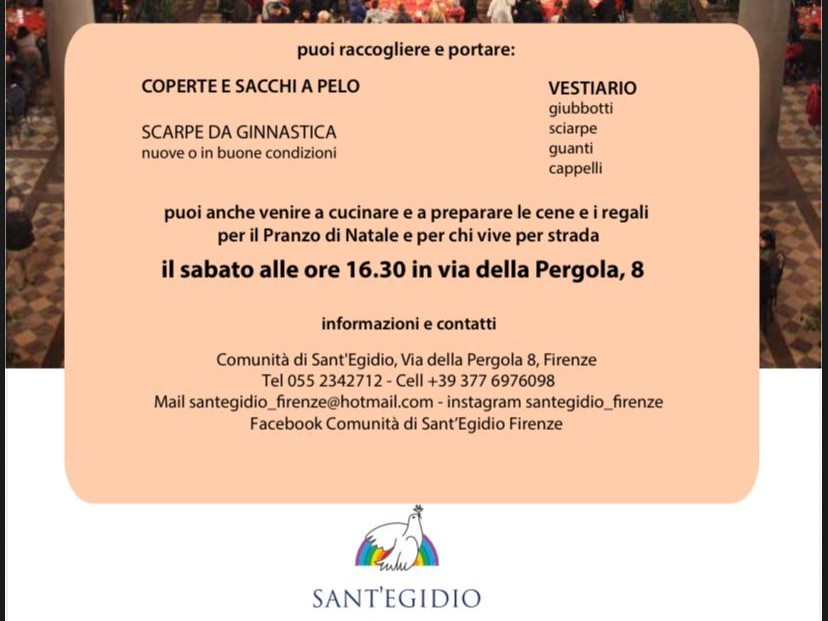 Chi desidera dare una mano può contattare la Comunità di Sant’Egidio telefonando allo 055.2342712 o scrivendo alla mail santegidio_firenze@hotmail.com. Ci sono diversi modi per aiutare: