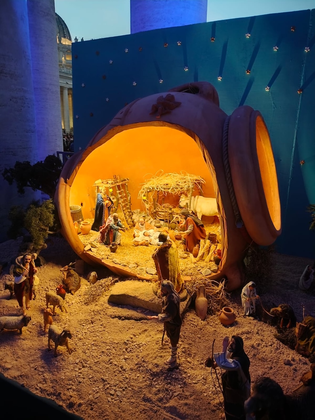 Una è un presepe: è adesso in piazza San Pietro in Vaticano, sotto il Colonnato del Bernini. Arrivato a Roma da pochi giorni, rimarrà nella mostra dei cento presepi organizzata dal dicastero per l'evangelizzazione. Si tratta di un orcio di terracotta scavato, aperto e tagliato, in cui all'interno è collocato un presepe meccanizzato con una Natività molto particolare. C'è una struttura che sorregge l'orcio - realizzato dalla Florentia di Capraia - con altri personaggi in movimento delle varie scene quotidiane, e poi animali, quindi pastori ed altri ed altri personaggi in movimento: la particolarità è che è un presepe meccanizzato con una ventina di movimenti.