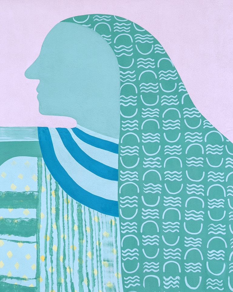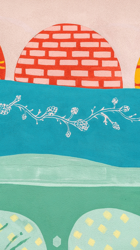 La palette cromatica utilizzata richiama le diverse fasi di maturazione nella coltivazione del carciofo, una coltura molto diffusa sul territorio empolese. La figura di destra si veste di tonalità fredde con ampie campiture nei toni dell’azzurro acqua, sul lato sinistro si contrappone una rosa di colori caldi e avvolgenti. In entrambe le sezioni compaiono numerosi elementi realizzati con colori complementari, che contribuiscono a creare un effetto visivo complessivo equilibrato e armonico.