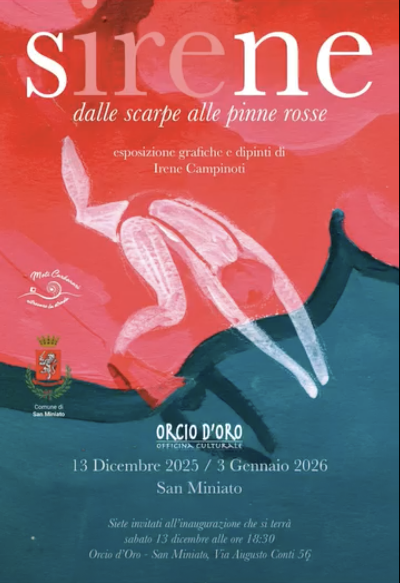 Come ha scritto l’artista questa mostra dell’Orcio: “Sirene, dalle scarpe alle pinne rosse”, ha un interessante primato: “È la prima volta che espongo in un luogo reale le mie opere. È un percorso sintetico che racconta gli ultimi cinque anni di grafica e pittura. Vi aspetto. Non vedo l’ora di mostrarvele e parlarvene faccia a faccia”.