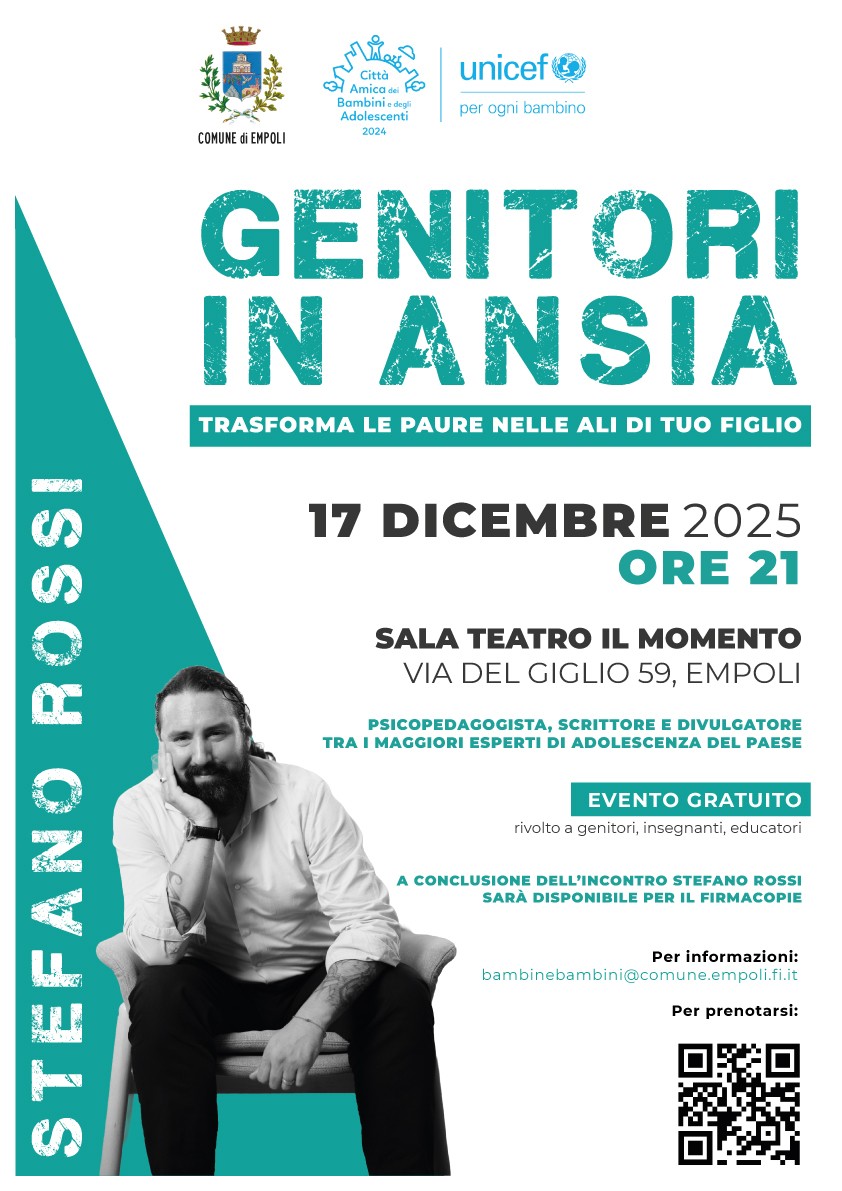 Cambio location per l’incontro pubblico con lo psicopedagogista, scrittore e divulgatore Stefano Rossi: “Genitori in ansia”, trasforma le paure nelle ali di tuo figlio, che si terrà mercoledì 17 dicembre 2025, alle 21, non più nel Cenacolo degli Agostiniani (via dei Neri, 5) ma alla sala teatro Il Momento di Empoli (via del Giglio, 59) e sempre su prenotazione da effettuare all’indirizzo https://www.eventbrite.com/e/1975562496608?aff=oddtdtcreator