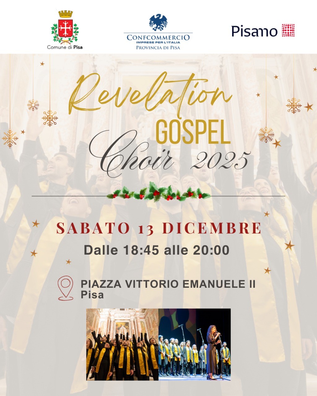 Sempre sabato 13 dicembre, in Piazza Vittorio Emanuele, ad arricchire l’atmosfera natalizia sarà il Revelation Gospel Choir, con il concerto pomeridiano che prenderà il via alle 18.45.