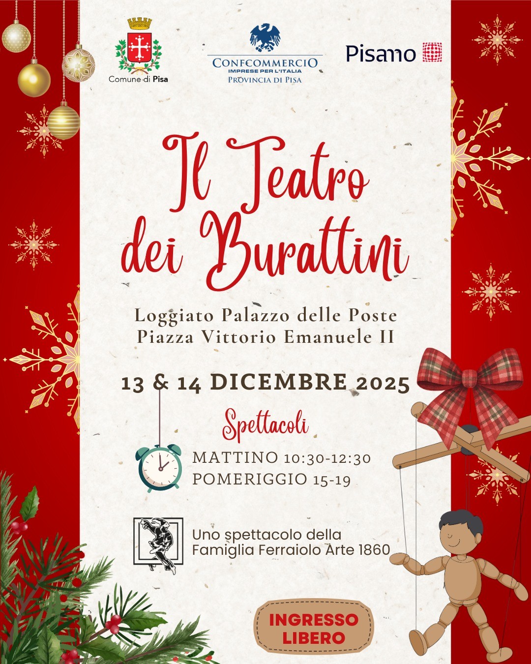 Tra gli appuntamenti principali, nel fine settimana del 13 e 14 dicembre il Loggiato del Palazzo delle Poste ospiterà la Compagnia Famiglia Ferraiolo, che porterà in scena le sue tradizionali commedie dell’arte del burattinaio. Le rappresentazioni, programmate sia la mattina che il pomeriggio, saranno scelte in base al pubblico presente, con spettacoli più impegnativi per gli adulti e storie fantastiche dedicate ai più piccoli.